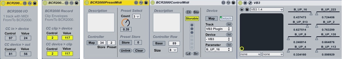 Version 1.2 has an enhanced parameter feedback conduit: Prior versions sent the current Ableton parameter value back to the BCR2000 hardware only when attaching to device parameters, but with 1.2 it uses live.observer objects to immediately reflect parameter changes made e.g. on a VST/AU GUI back to the BCR2000 LED rings.