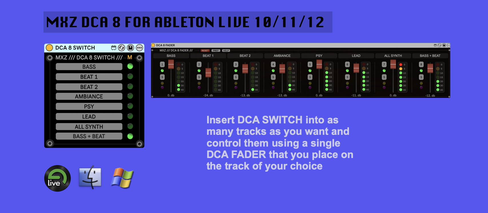 | Description: | DCA 8 is a Max for Live device that brings true DCA mixing to Ableton Live. Control the volume, mute, and solo of multiple tracks at once—without affecting your internal mix balance. Ideal for mixing, automation, and live performance. Here’s a short demo video: https://youtu.be/a-4XRb4U8yM |