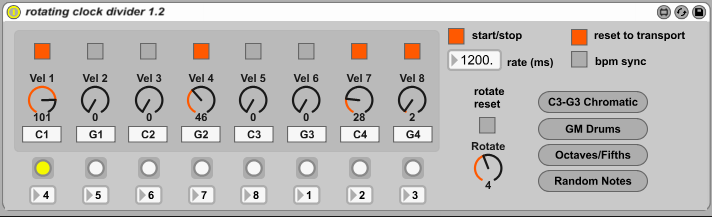 | Description: | The Rotating Clock Divider is a type of MIDI sequencer which takes a clock/metronome rate and outputs pulses at different subdivisions ( rate/2, rate/3, rate/4, etc.), for easily creating complex polyrhythms and textured "modular" sounding sequences. It is based on the 4ms RCD Eurorack module. version 1.2: added the ability to tune the pitch of individual steps, and a few pitch presets. UI overhaul. version 1.1: added "sync to BPM" toggle. Clock rate is stored properly with saved projects. It is now possible to automate clock rate. Minor UI cleanup. ========================= Rotating Clock Divider Max For Live MIDI Effect v1.1 by Bunny Blake (h_double) discolingua@gmail.com http://discolingua.com @discolingua this effect uses code from Michael Hetrick's Euromax for Max/MSP http://mhetrick.github.com/Software/euromax/ Thanks to Icaro Ferre, whose mod of this device (http://www.maxforlive.com/library/device/1801/rotating-clock-divider-icaro-ferre-mod) suggested some improvements and cleanup I have folded back into my version. ======================================================== HOW TO USE The Rotating Clock Divider (henceforth RCD) takes a clock rate of n milliseconds. It transmits that rate to 8 outputs, each of which trigger a MIDI note at a rate that is some division of the main clock rate (n/1, n/2, n/3... n/8) This allows a large variety of polyrhythms to be dialed in, either free-running or synced to the Ableton Live transport. It is ideal for generating complex rhythmic textures and "floaty modular synth bloop"-style sounds. The outputs can be tuned to different pitches, with a few presets: "C3-G3 Chromatic": MIDI notes 60-67. This works well plugged into Live's "Scale" MIDI effect. "GM Drums": kick/snare/hats/etc. Use this to drive a Drum Rack preset or other beat box. "Octaves/Fifths": stacked octaves & fifths (C & G in 4 octaves). Good starting point if you want a bunch of notes which will sound harmonious with each other. "Random Notes": mash repeatedly until you arrive at some interesting chaos. The RCD effect is designed to be used in a few different ways: 1. It can drive a synth directly, using the Live "Pitch" and "Scale" MIDI effects to tune it to a musically useful range. A synth patch with velocity sensitivity and a fairly quick attack/decay is generally best. 2. It can be used to trigger samples in a Drum Rack (or other drum sampler or beatbox). Use the "GM Drums" mode for best results. 3. The RCD can be used to drive an Instrument Rack with 8 chains, each chain filtered to a single MIDI note. This way, each RCD output pulse can drive a separate synth/effects chain, for maximum modular-style madness. ======================================================== CONTROLS START/STOP: The RCD will automatically start/stop in sync with the Live transport, it can also be started manually in free run mode with no transport running (or stopped without interrupting the Live transport). RATE: Set the main clock rate in milliseconds, the time between pulses at the longest division. RESET TO TRANSPORT: When engaged, the clock will reset with every bar of the Live transport, to make it easier to sync to other tracks in a song. BPM SYNC: Locks the RCD's clock rate to Live's master tempo. TOGGLE BUTTONS: Allows each of the 8 output stages to be armed/muted. VELOCITY DIALS: Sets the velocity for each of the 8 output stages. PITCH CONTROLS: Sets the pitch for each output stage to any MIDI note number. ROTATE: Shifts the divisor for each of the 8 output stages, as shown by the indicator beneath the individual columns (e.g. incrementing Rotate causes output 1 to divide by 2, output 2 to divide by 3, all the way to output 8 which wraps back around and divides by 1). ROTATE RESET: Resets the clock sync every time the Rotate control is changed. This may cause a subtle "jump" whenever Rotate is adjusted, but when Rotate Reset is turned off, the output pulses can drift out of sync with one another when the stages are rotated. This could be useful weirdness, so experiment! ======================================================== KNOWN ISSUES - Starting the Live transport automatically switches on the "reset to transport" sync control (you can manually switch it right back off). This is a workaround because otherwise the effect wasn't always properly detecting the state of this switch when started. - Proper patch save/restore is still on the TODO list, but if you save a project containing this effect, the effect state will be saved with the project. ======================================================== THANK YOU FOR YOUR INTEREST IN THIS PLUGIN If you find it useful and would like to show your support, please take a moment to visit my Bandcamp page and buy my album! http://seven4seven.bandcamp.com |