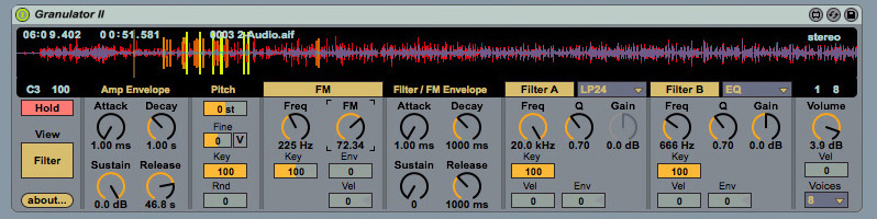 | Description: | Granulator II is a Max4Live synthesizer based on the principle of quasi-synchronous granular synthesis. It creates a constant stream of short crossfading sections of the source sample, and the pitch, position and volume of each grain can be modulated in many ways to create a great variety of interesting sounds. Granulator II also offers two multimode filters in series to further shape the resulting timbre. Granulator II is the latest incarnation of a series of granular based synthesizers I wrote for my own usage since the additon of real time audio processing to Max in 1997. |