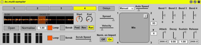 | Description: | view demo video: https://vimeo.com/63051845 - this Max4Live instrument enables the simultaneous playback of four sample buffers of arbitrary length, with up to 16 voice polyphony - drag and drop samples from the live browser - an X/Y pad provides control over the overall mix between the four loaded samples - automated sample start position provides a level of unpredictability and variety to sample playback - independent loop and pitch bend for each sample - independent filtered delay lines for each sample - option to normalise files on import |
