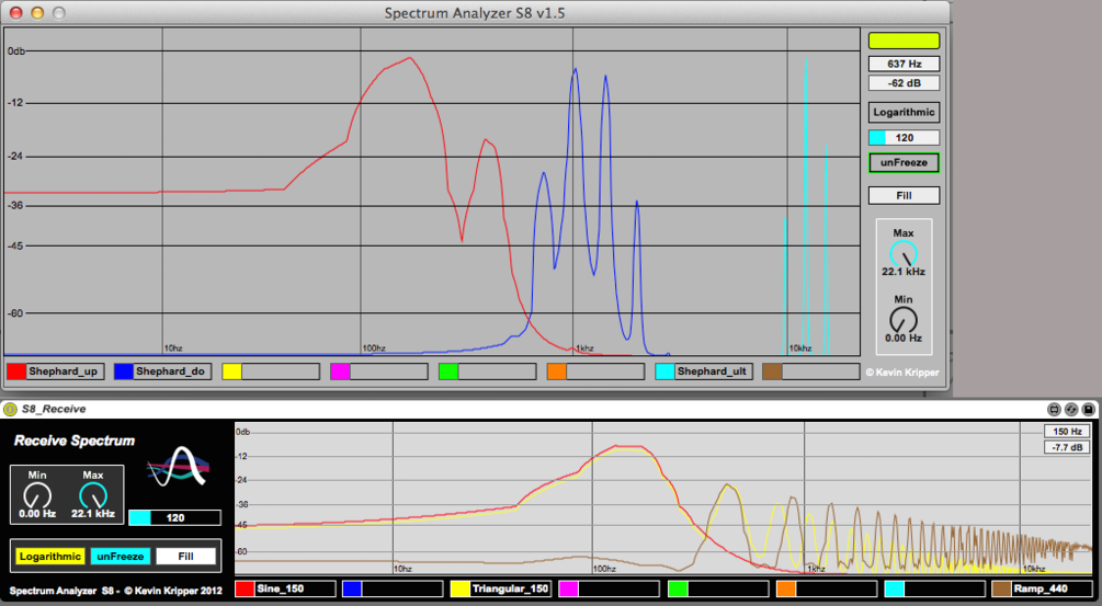 | Description: | Spectrum Analyzer S8 is a multiple-track real time spectrum analyzer. It lets you visualize the spectral content of 8 stereo tracks simultaneously. You can use it as a frequency overlap detector and actually see which part of the spectrum every single instrument uses. The ideal solution for mixing! - The M4L version is inspired by the Standalone version, which went 17th place of 55 devices in the Kvr's DC12 (www.kvraudio.com, Developer Challenge 2012): http://www.kvraudio.com/product/spectrum-analyzer-s8-by-kevink --------------------------------------------------------------------------------- Usage: S8 is actually very simple. You have 3 modules: send, receive & receive (floating). Put the S8_Send module as an insert in each channel you want to visualise in the spectroscope (which is in any "receive module"). Once you have done that, you need to select a send for each track: you do this by clicking in the numbers (1-8) of the S8_Send module. Each of them have a distinctive color so you can recognise the channels in the spectroscope. Finally go to the Master track on your session and add the S8_Receive module as an insert to visualise the spectrums. Enjoy! --------------------------------------------------------------------------------- V.1.5: - S8 is again fully compatible with Live 8. - Change GUI. - Added a Fill/Don't Fill Waveforms button. - Added labels to write what is showing each waveforms (saved with session). - Added a slider to set the polling interval of the Spectroscope. - Added a fixed dB and hz visualisation (hz visualisation is only shown when Spectroscope range is 0-22050). - Fixed dB visualisation: was showing from -45dB to 0dB, now goes from -70dB to 6dB. - Fixed Log/Linear button. V.1.4: - Updated to Live 9. - Now S8 is post-fader. - Added a "Show Parameters" button (On/Off)in S8_Receive module. - Added descriptions in Live's Info View. V.1.3: - General code clean up. - Fixed an issue with the frequency display. - Change GUI. - Built a module that is only a floating window with the spectroscope. V.1.2: - Added an always-stay-on-top button for the external window. V.1.1: - Added buttons to control parameters in the external view. - Added a detailed display of frequency and amplitude in both views. |