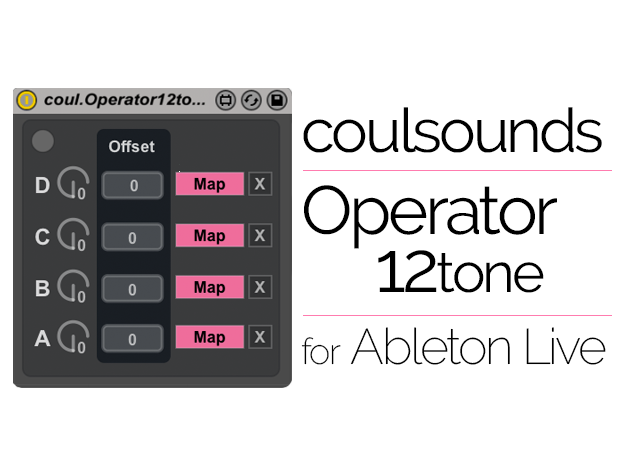 | Description: | This device allows you to map the 'Fine' parameter on Operator and control it in semi-tones (rather than 1000ths of a tone). There are 4 selectors for each of the operators and an offset feature to fine tune your sound. A great use for this device is playing chords in 'mono' mode, which means you can still use the 'glide' feature. When using the algorithm where all four operators are individual sound sources, this device effectively turns Operator into a 4-voice subtractive synth. Release Notes: v.1.1 - Updated the offset parameters so that they can be MIDI controlled/automated. v.1.2 - Added a reset button to resend note values. Included in the download: Operator 12tone v.1.2 User manuel Check out http://coulsounds.com for more details. This device is available to purchase from the Sellfy link below. A promo code to get this device for free comes with any purchase of the coulsounds-Sync Tool: https://sellfy.com/p/D8mB/ http://www.maxforlive.com/library/device/1756/coulsounds-sync-tool-and-synchronisation-pack |