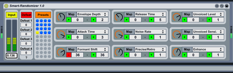 | Description: | This is a further development of my FX_Randomizer device (http://www.maxforlive.com/library/device/1892/fx-randomizer) In my live-performance-setup I did not want to use the same FX-setting all the time. But I also did not want to bother about setting all the numerous parameters of an effect during a live performance. So this device enables me to have different effect settings each time I use the effect. It modulates any parameter of live or a plugin. Put it behind the modulated effect/instrument and as soon as there's audio coming out, the modulation stops! When used with insert-effects I assign the same midi-controller which controls the effects dry/wet parameter also to one of the devices "defeat" parameters. So as soon as the dry/wet value is above zero the modulation stops. I added a preset-browse-matrix. If you don't want totally randomization you can store your own settings (set the dials and shift-click on a dot in the matrix). Switch to Preset-mode and all preset will switch randomly until the modulation is defeated. Setup: - put this device behind the effect/instrument you want to be randomized - assign the modulations (if 9 modulation is not enough for you, just put a second device in the chain / modulating macros of an instruments-or effectsrack may do the trick also, since you can assign one macro to several parameters) - set the min. & max. for the modulations. (modulation below zero might be required for some of live's parameters) - If used behind an instrument or send effect turn on the Input (this will defeat the modulation on audio-input) - when used on a send effect / return channel, it may also be a good idea to assign the same mici-controller which controls the send levels to this return to the defeat-parameters. Otherwise the modulation stops just shortly after any audio is comming in, resulting in a short glitch noise. - If using the preset mode, I advise you to turn off the Input and also manually defeat the modulation to setup your presets. Otherwise the device might start switching presets while you're trying to set the parameters. For feedback and suggestions: johann.niegl@hfmt-hamburg.de |