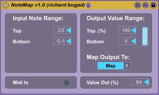 | Description: | NoteMap is a MIDI device that maps a desired MIDI note range to a mappable parameter value range. It's intended for use with Abletons Resonators effect, which has a note knob. This knob seems to be impossible to control with MIDI notes, so i was looking for a max device that does the trick. Unfortunately I didn't find such a device so I decided to build my own one (... well not all on my own, since I used the mapping code of MultiMap.amxd ...). You will also find a demo instrument which demonstrates NoteMap & Resonators with the following link: |