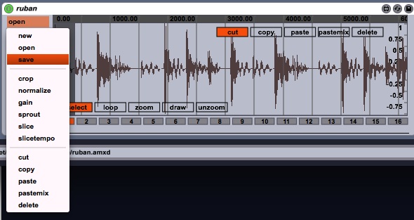| Description: | Ruban is a sampler that is build to work with one single but large buffer. This buffer comes with editing features (like cut/copy/paste) so the it can be modified directly into the sampler; to act like an 'old' tape audio collage. It has 16 active slices or zones that are triggered via midi note 36 to 51. Each zone have their one envlope, pan and sample speed. If you drag a .wav of .aiff file into the "wave display", the content of this wave file will be copied into the device clipboard. And no, this clipboard is not available outside the application, I'm still trying to find a working piece of code that can read .wav file via the system windows/os x clipboard. Special functions are also available to modify the buffer or change the borders of the zone : "gain" : multiply the sample amplitude by an ask value "sprout" : copies the beginning of a zone by an ask value "slice" : create 16 equals zone within the buffer "slicetempo" : places the end of the zone by an ask value in bars; 1 = 1 bar "pastemix" : paste the content of the clipboard by mixing with the content of the buffer "delete" : reset zone content to 0 This Max max for Live device requires Java (for buffer edition) |