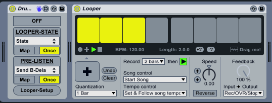 | Description: | A handy little one-trick-pony: in my live-performance I use the Arturia Spark hyprid drum machine. I had the problem, that when switching a soundbank, the plugin doesn't play drums for a few secs. So I wanted to utilize Live's Looper to record & play 2 bars of drums before switching the soundbank, so the Looper covers the hole in the drums. At the same time I wanted to be able to pre-listen the new loaded drumsounds. So with this device I just assign a toggle button of my midi-controller to the devices ON/OFF button. I also map the devices "Looper-state" to Live's Looper State buttons and the "Pre-Listen" to the send level to a pre-listening return-track. (Click the "Looper-Setup" button to see how the Looper should be set up.) Now every time the Looper-control device is switched "ON" the Looper starts recording 2 bars of audio and subsequently playing. At the same time I'm able to pre-listen the next loaded sound befor I turn the device "OFF" and the looped audio is replaced by the newly loaded sound! For feedback and suggestions: johann.niegl@hfmt-hamburg.de |