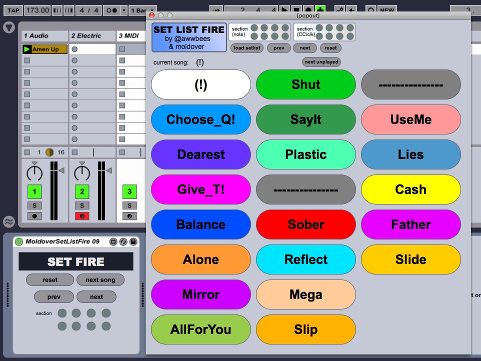 | Description: | Please see this free section of my Ask Video - Sound Control course for a quick explanation of what this device is and how to use it: http://play.askvideo.com/live-301-moldover-sound-control/24 This device is helpful in organizing large Ableton sets with many scenes into "sections" and "songs". Rather than dealing directly with hundreds of individual scenes, I group them into songs with up to eight sections. The SetListFire interface creates one friendly interface, that can access all the sections of dozens of songs. Set lists are created by editing text files. This method makes it easy to try out different set lists, edit them quickly with copy/paste, and save/recall them for different kinds of shows. An example setlist is included with the download. Note: to have a setlist automatically load with your Ableton set, you need to name your setlist "default_setlist.txt" and have it in a folder in one of your Max search paths. To add a Max search path, go into Max, go to Options->File Preferences, click the +, and add the folder where you put default_setlist.txt. Designed by @moldover (moldover.com) Implemented by @awwbees |