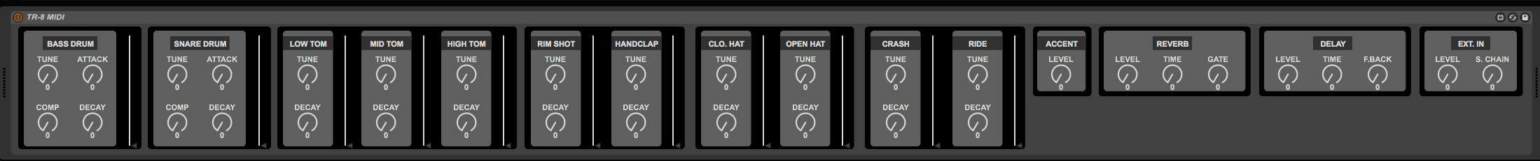 I had to upgrade Max to 6.1.7 to get another device to work, unfortunately this Max device doest react to tweaking the TR-8. All the pots in the Max Device are at the left most zero seting. Anything that can be done? Cheers, will be fantastic if we can record TR-* parameters into a Live set.