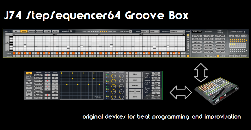 | Description: | The J74 StepSequencer64 & J74 PatDrummer plugin set is a collection of Max for Live (Ableton Live) devices for creative beat programming and improvisation. The pack features a powerful step sequencer, the StepSequencer64 device, providing advanced features such as in-key programming, step envelope modulation, multiple parallel layers, real time (MIDI input) transposition, random (in-key) sequence generation. Also in the set a programmable drum pattern-based box, the PatDrummer, able of on the fly patter editing-and-mixing, polyrhythmic sequencing, groove and random patterns. Both devices are included in the pack and integrate naturally within Ableton Live (e.g. they both support sequence export to MIDI clip, preset saving, automation, mappings). More Information on: http://fabriziopoce.com/GrooveBox64.html |