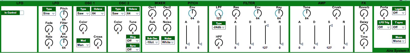 | Description: | Since Roland forgot to create a plug-out-VST for the Aira System-1 itself, I created this M4L device. I believe in keeping things simple, this reflects the UI. This is my first M4L device, feedback, bugs etc are highly appreciated. V0.2: Bug fixes: wrong labels on some drop down menu's New feature: recognises controller movements from the system-1. No more need to do midi mapping, make sure that in Ableton you send the system-1 midi signals in the chain and enable the in control box. I suggest to disable the in control button if you have automation going on since you actually create a midi loop when doing this. (it is not harmful, but can be annoying) |