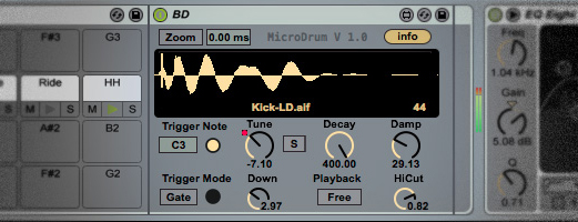 | Description: | A rough emulation of an old school 8 bit drum sample cell with some ideas borrowed from Roger Linn. Samples can be truncated at the beginning, facilitated by the zoom (Zoom) function which displays only 10ms of the drum sample, starting from the start point. Samples can be tuned up and down two octaves (Tune). Tuning can be quantized to semitones using the step function (S). There is a volume envelope for shortening the decay (Decay), and an anti aliasing filter (HiCut). More info at http://www.roberthenke.com/technology/microdrum.html |