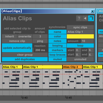 | Description: | Alias Clips is a Max for Live device that brings the functionality of what are commonly called alias clips, ghost clips, mirroring etc. to Ableton Live. The core concept is that you can duplicate a MIDI clip and have the original and the duplicates be linked, so that when you modify one of them, the duplicates will automatically update themselves with the same modifications. This is not a replacement for native Ableton functionality but it is stable enough to be an adequate workaround. For a video demonstration and detailed illustrated explanations follow the download link. This is a commercial device priced at $10 USD |