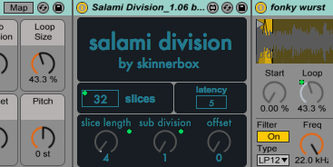 | Description: | **UPDATE** version 1.06, added latency settings, go up with the number incase you encounter inconsistencies with the playback (happens if you play your files from a slower drive) you can then compensate the latency by giving negative track delay. Salami Division by skinnerbox turns simpler into a sampler-slicer, with similar functionality to "slice to midi" but with some tricks up the sleeve like sample-hotswap and dynamic slice number. unlike slice to midi, if you use push salami division lets you mash up to 64 slices on one page! watch the demo video here: https://www.facebook.com/video.php?v=10153067866813407&set=vb.275530503406&type=2&theater |