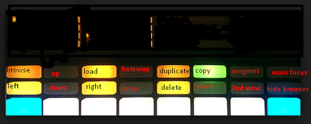 | Description: | (windows only) uses KEYSTROKES to LOAD and BROWSE audio clips... load onto a midi track. select push as control surface (make sure push is surface 1 in prefs). press and hold octave up + press octave down.the tap tempo button light should go out. press tap tempo button to enter key mode. the top 16 buttons will light. key functions in screenshot (operates on screen in focus) |