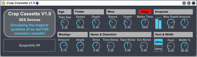 | Description: | Emulating the sound of a good old C90 playing back on a less than perfect deck, Crap Cassette attempts to take you on a nostalgia laden trip back to the golden age of the compact cassette, maybe leaving you with a tear in your eye. The only thing missing is the pencil needed to wind the tape back in when your deck turned your favourite album into a pile of brown plastic spaghetti. No explanation of the controls should be needed, but suffice to say the effects can range from subtle to downright nasty. SES |