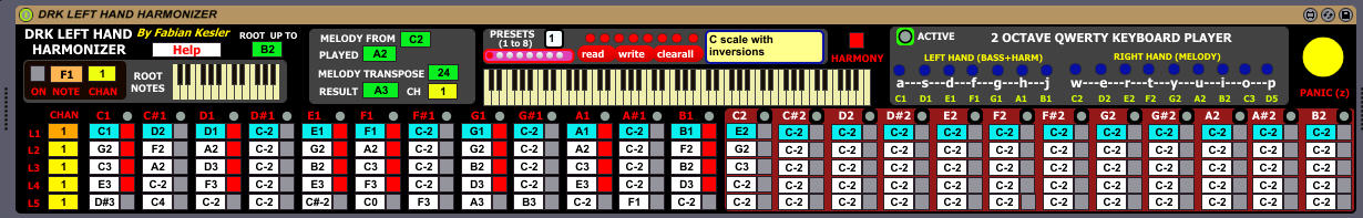 | Description: | VIDEO TUTORIAL: https://youtu.be/X8PO2rhHrmE DRK LEFT HAND HARMONIZER IS A SOFTWARE THAT ALLOWS YOU TO PLAY COMPLEX PIANO TEXTURES WITH A LITTLE KEYBOARD (2 OCTAVES) AND ALSO INDICATED FOR PEOPLE WHO ARE NOT EXPERT PIANO PLAYERS. YOU CAN REASSIGN ALL THE KEY TO PLAY ANOTHER NOTE, OR NOTES, UP TO 5 NOTES FROM EACH. SO GETTING COMPLEX CHORDS WITH BASS BY JUST PLAYING ONE NOTE. DIFFERENT TO “CHORDER TYPE” PLUGINS, YOU CAN BUILD DIFFERENT CHORDS ON EACH NOTE. IN ADDITION, YOU CAN TRANSPOSE JUST THE ZONE OF THE KEYBOARD FREE TO THE MELODY. THIS WAY YOU CAN USE ONE KEYBOARD OCTAVE TO GET BASS AND CHORDS, AND THE OTHER OCTAVE TO PLAY MELODY ON THE TREBLE ZONE, GETTING A FULL PIANO PLAYING WITH A MINI KEYBOARD. MORE VIDEOS, HELP, ABLETON TEMPLATES, MAX AND STAND ALONE VERSIONS HERE: http://fabiankesler.blogspot.com.ar/p/max-msp.html Author: Fabian Kesler - fvkesler@gmail.com |