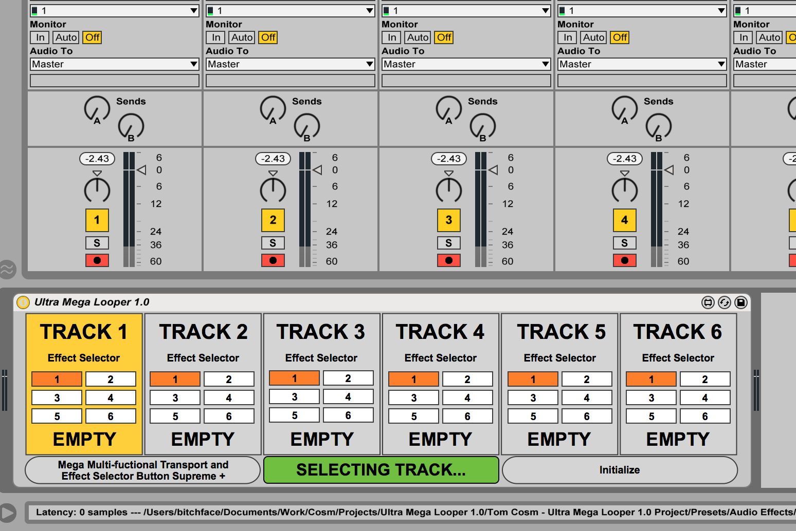 | Description: | I made this today because I get hit up now and then about how to easily record live looping into separate layers. The device has one single button, and depending on how you use the button different things happen. If you hold the button down for more than 1 second, the device will enter Track Selection mode. In Track Selection mode you hold down the button to cycle through the tracks, letting go when the track you want is highlighted. Once a Track is selected, click the button once to start recording a loop. Click it again to stop recording the loop. Double click it to delete the current loop. Holding down the button while a track is selected for half a second will enter the device into Effect Selection Mode. When in Effect Selection Mode, hold the button down to cycle through the 6 different effects. You can set up your own effects for each track by modifying the devices in the Audio Effect Rack. Finally, hold down the button for more than a second to return to Track Selection mode where you can move on to a new track. Let me know if you find any problems, or have any feature requests! Free download - https://www.dropbox.com/s/okbz0ymy8axt16h/Tom%20Cosm%20-%20Ultra%20Mega%20Looper%201.0%20Project.zip?dl=0 |