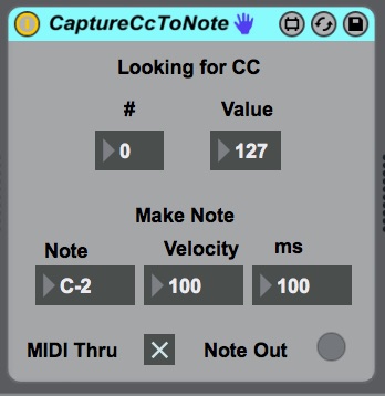 | Description: | This device looks for a specific control change number and value specified by the user. On a match it send a midi note also specified by the user. (Useful to capture a toggle cc control button which alternate 0 and 127 value to make two independent events launched by midi notes trigger) |