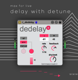 | Description: | Dedelay is a max for live device that allows you to choose a note to delay with detune on every repetition. You can go up or down and choose the rate of the repetitions: to do that you can operate manually or analyze your incoming sound with an envelope follower. VIDEO DEMO: https://youtu.be/UdibFXpVk3w |