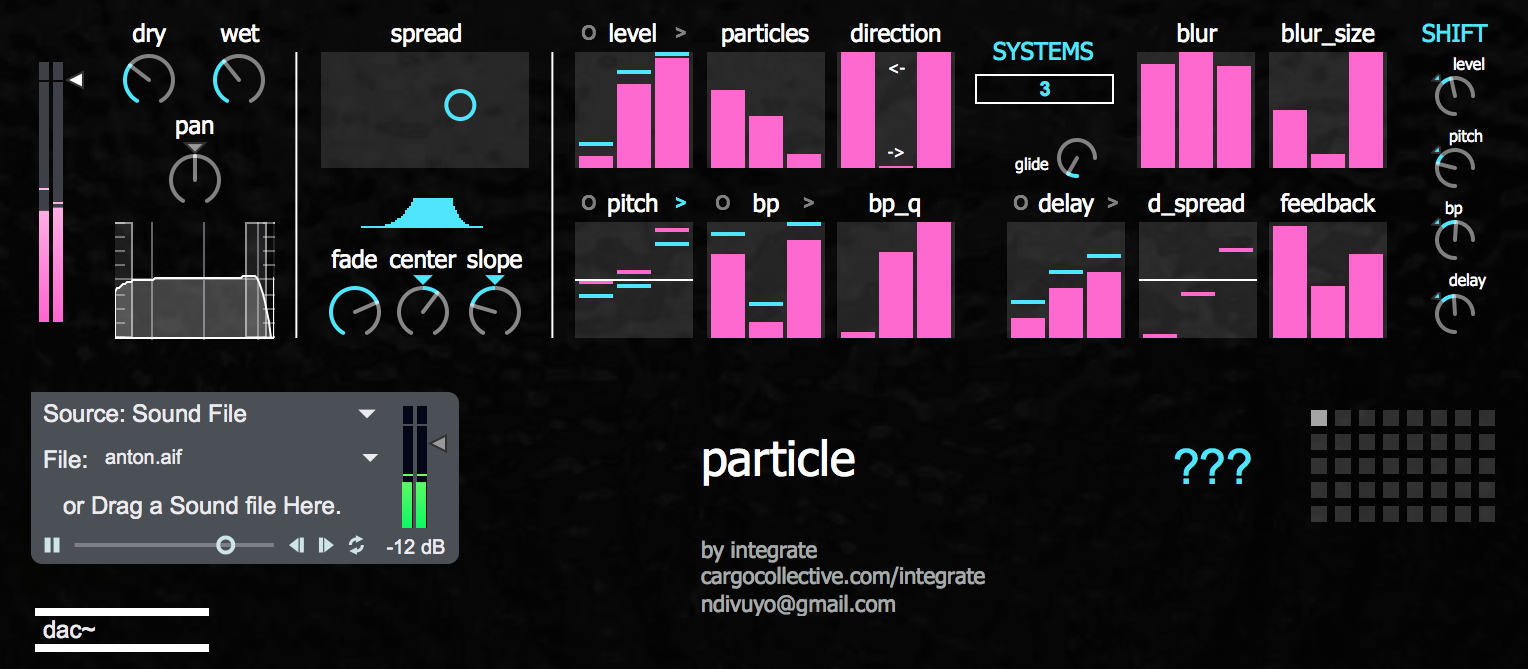 | Description: | particle is a FREE granular delay. Create multiple systems of "particles" (voices) with individual processing to create blurring textures, reverbs, or experimental delays. Another feature is your ability to record automations for the multisliders, creating more variation Individually process each system's: -Volume level -Particle amount (grains) - Playback Direction -Pitch -"Blur" and Blur size -Bp filter freq and q -Delay time -Delay time spread -Feedback Also: -Spread panning of particles -Randomize -Wet mix options **Careful on adding many particles/systems, very CPU expensive **Go to the dropbox link below to get the .zip with the msp patch More of mine: cargocollective.com/integrate Questions/comments/requests: ndivuyo@gmail.com |