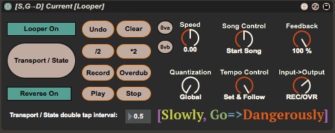 | Description: | The [Slowly, Go→Dangerously] Current [Looper] is a Max For Live device that allows you to create a single set of midi mappings that will be applied to the Ableton Looper currently in focus. The Current [Looper] also provides a mechanism to generate key events that allows you to control the Undo, Clear, “\*2”, “*2”, mini record, mini overdub, mini play, and mini stop buttons via midi as well. Please take a look at my YouTube walk through: https://youtu.be/kteUZOlUK1w You may purchase the Current [Looper] device here: https://gum.co/SGD-Current-Looper Thank you for your interest in my work. Your generous support allows me to continue developing tools that allow musicians to more easily pursue their muse. |