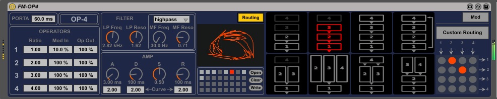 | Description: | Hello, OP-4 is back! :) Some troubles with the freezing function on first version.. (thanks to kleine which avert me!). Normally now it work. This allowed me to add some improvements. OP-4 is Four operators FM synth. There are modulation in depth, modulation out depth for each Operators. Only Operator 1 is out, the others operator is just for modulate. There are 8 pre-routings for operators comonly used for Fm synthesis, but with the matrix you can more than the eight pre-routings. Remember, if you use your own routing rather than the 8 pre-routings you need push the button "custom routing" ON otherwise the routing is not save with your set live. may be It would be better save presets before close set. There are two filters in series, one is Lowpass Filter which go in an multi modes filter. There are eight modulations with five sources and nineteen targets. The modulations sources are two AD envelopes and three LFOs. The LFOs cand be sync or hz, it can be reset with new note. it can be one shoot and you can define the number of cycle that are repeat. There are one ADSR dedicated to the Amp. You can define curve for each enveloppe (1=linear less than 1=log, greather than 1=exp) There are function portamento. For envelopes: if notes is overlaped or without space between each, it is considered like one note. the preset box can be driven with cc3. Save preset on hhd before close your set if you test it, please tell me if the patch can be loaded without issue. Normally i checked this and is good, but i've doubt with freezing. thanks by advance PS: i've make an little track with only OP-4 like sound generator. You can hear some possibilities of this little synth. the kick is.. little bit opressive for some of my friends sorry by advance :) and sorry for my english! https://soundcloud.com/dric/op-4-fmsynth-test-m4l-device |