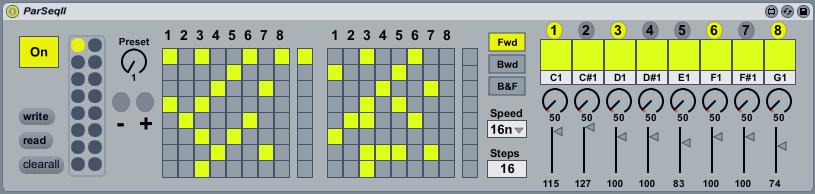 | Description: | ParSeqII is the new and improved version of my previously posted ParSeq. It is a simple 16 step sequencer built with the Launchpad in mind, but that can be easily used with any other grid controller. You simply have to assign the buttons on your controller to the buttons on ParSeqII via midi mapping, including the step indicator rows to the right, which on the Launchpad are to be assigned to the scene launch buttons. The idea is to have steps 1-8 to User1 and 9-16 to User2 on the Launchpad (or two pages on your controller). There is a simple midi mixer to the right, with channel on/off, note, duration, and volume selectors. You can store up to 16 preset sequences (the presets do not affect the mixer or sequencer parameters). There is also a preset knob selector and - & + buttons to navigate the presets. All these are very useful when assigned to hardware midi controllers and buttons. To store the presets Shift+Click on the small grey buttons. To save your preset set, press "Write" and save to an external file. Open it later pressing "Read". I have also made another module called ParSeqRecieve (look for it in the library) which can be placed on other midi channels in Live to receive Note On messages from each ParSeqII channel. A more efficient way to use ParSeqII is to put instruments on other tracks and set their input to receive midi from the channel where the sequencer is at. Then you have to use the "Pitch" Live Midi Effect to filter out all the notes except the one of the corresponding track of the sequencer. Either way, it is fun to place midi clips with note sequences and/or transpose envelopes on the tracks and launch them at the same time. All midi data gets through and the results are interesting. You can even do note sequences longer than the 16 steps of ParSeqII. |