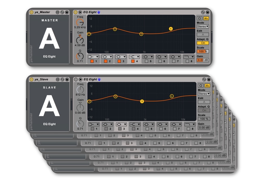 | Description: | make any Live device multichannel capable this device pair allows you to link Live's standard (audio) devices across tracks & sends. v.3.5 with fixes and optimisation especially for Live 10.1 • 10 groups (A-J) are supported per live set. • place ya_Master just before any of Live's audio effect device you want to make a master • place ya_Slave just before the same kind of device in any other track, send or rack to make it a slave. • any changes to the master device are also affecting all slaves of the same group • any automation of the master device also affects the slaves • pre configured master & slave racks for all Live standard audio effects are included. • tip: experiemts of multiple slaved effects withing one track are fun too. please note: These devices have been created for our own use and only been tested on Mac. If you run into problems you may send reports and comments to contact@yarhammer.com However, we do not officially offer support and might not be able to help or answer at all. v2.3 fixed saving of the master's group setting. a specialized version for EQ Eight that allows inverting the Scale parameter is also available here: http://www.maxforlive.com/library/device/3827/yaeq8-multichannel-eq-eight |