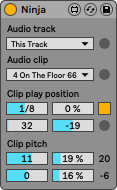 | Description: | With Ninja, you can randomise the playback position of an audio clip in your Live set. As an addition, you can randomise (or automate) the coarse and fine pitch settings of the clip. Attention ! Using the pitch randomisation function could fill your undo history! https://www.youtube.com/watch?v=mUO9_Qg_ctc Version History : 2.o1 - Click on the device logo now shows numbers instead of sliders. 2.o2 - Updated to Live 10. (Important! If you're still using Live 9, please, stick with the old version! There are major UI changes in Live 10, these will look ugly under 9) 2.o3 - fully new clock generator, more stable and reliable 2.o4 - Ableton banks support added for Push 2.o5 - minor UI fix 2.o6 - "ClickMail" feature added (shift+click on the logo to directy mail to us!) 3.oo - update UI 3.o1 - Apple silicon check 3.o2 - dynamic UI 3.o3 - Live 12 compatibility check |