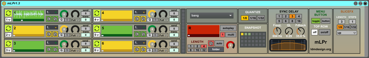 | Description: | *Now available muLtiPr0 - multitrack version of mLPr ---> https://gum.co/dxvi * Based on the fantastic MLR monome patch, this patch gives you live looping power. 6 loop tracks, mapped to rows on the launchpad, with independent controls for gain, filter and fx send. The fx is a sync delay. There is also a recording channel to record your slicing, which can also be then copied back to a track's buffer. Video tutorial here - https://vimeo.com/184917089 v1.3 - Snaphots save all settings and buffer contents with the Live set. Slice mode. Slice FX. v1.2 - Loop/One play options. Transpose. Record multiple tracks at once. Save from any track's buffer. Variable file type. Autoplay recorded track. Menu button and top row preferences. Recording source in LP menu. Meter to avoid clipping, and just in case, a limiter at the end of the chain. v1.1 - Now 6 loop channels and only one record channel, which can then be copied to any of the other channels by holding the yellow 'down' button and pressing a pad in the top row. The green 'up' button now opens a menu where you can change the quantization time, the delay time and the recording length directly from the LP. Documentation - http://ldmdesign.org/wp-content/uploads/2016/09/mLPr_documentation.pdf |