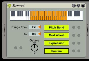 | Description: | Zpwned is a simple MIDI utility for creating virtual keyboard zones. Use it to chop your keyboard up into different sections for different instruments. You can also set an octave shift for the zone and set whether Pitch Bend, Mod Wheel, Sustain and Expression messages are allowed through to the instrument. I created this because I got really frustrated with the menu/tiny screen/multiple buttons/impenetrable manual that I'd have to deal with to do this with my MIDI controller hardware! This device is designed for a 61-note keyboard but by changing the parameters for the Range From, Range To and Keyboard Slider objects you could easily adapt this to any size of keyboard. The really neat thing about this is that, because all of the controls are parameters in Ableton Live, you can change the size and function of your keyboard zones on-the-fly using automation in your Live set! Enjoy, and please give me feedback to improve my programming skills! |