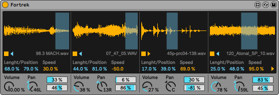 | Description: | Fortrek is inspired by the old, four track, cassette based multitrack recorders. Nowadays, these machines are used by experimental artists, with cut and taped, "endless loop" cassettes to create drones, ambient textures and background noises. With Fortrek, you can enjoy the creative benefits of this technique, without cutting tapes and recording / overdubbing loops. https://www.youtube.com/watch?v=UqixYldJGB0 Version History : 2.o1 - Click on the device logo now shows numbers instead of sliders. 2.o2 - Updated to Live 10. (Important! If you're still using Live 9, please, stick with the old version! There are major UI changes in Live 10, these will look ugly under 9) 2.o3 - feature request implemented : multi-channel output! 2.o4 - feature request implemented : loop fades on/off 2.o5 - from this version all of the previous controls are independent for all 4 channels; full randomisation and full reset to initial implemented; preset save and load implemented (incl. sample paths!) 2.o6 - Ableton banks support added for Push 2.o7 - save/load bug-fix 2.o8 - minor UI and bug fixes 2.o9 - from now on, Fortrek won't fill up your undo history in case of random Spectral Freeze! (thank you very much /m for letting me know) 3.oo - new UI, gain trim (tape distortion) and tone control on every channel, pitch issue fixed 3.o1 - Apple silicon check 3.o2 - dynamic UI 3.o3 - minor UI update 3.o4 - Live 12 compatibility check 3.o5 - user request for Push names (shorter) and for alternative playback mode - now Fortrek could run together with Live |