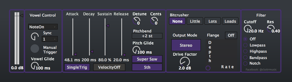 | Description: | Monovowel is a monophonic Max For Live instrument intended to mimic the strange vowels and artefacts of early speech synthesising chips. Listen to the audio demo - https://soundcloud.com/cluttr/monovowel-plugin-demo Watch an awesome accompanying video - https://www.instagram.com/p/BRWMlr6gHjz/?taken-by=adamlsaunders I'm charging actual money, but not very much (one seventy-nine). |