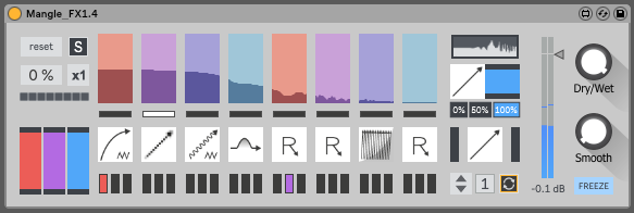 | Description: | The Mangle FX takes any incoming audio and mangles it through a tempo-synced multi-effect sequencer and Send controller. This has the same functions as the Manglerack, with extra control for the Sends, Wet/Dry amount and Freeze mode. Fine controls allow all out randomised chaos or subtle glitching effects. Smooth eases in and out with each section of playback if necessary to avoid clicks. Video Demo - https://vimeo.com/212237032 v1.52 - Small update to fix a minor bug with Sends sequencer. v1.51 - Completely redesigned preset system. Now saves everything without writing to the undo history. v1.4 - Live 10 compatible. Volume drop after certain modes fixed. v1.2 - The Sends controller can now be turned off for anyone who prefers to automate or have live control of the sends |