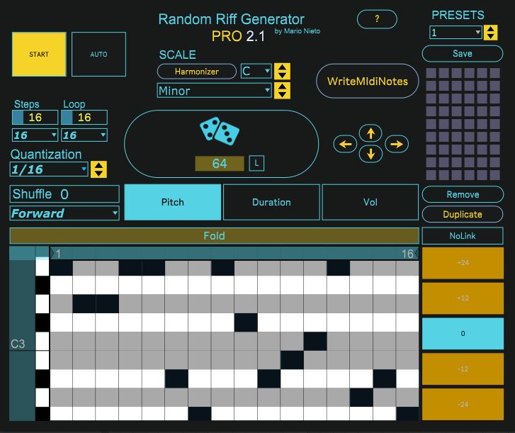 Description: Random Riff Generator PRO 2 is a midi tool that generates sequences for you, these midi sequences/riffs can be sent to any synth, software or hardware, sampler, drum machine.. and basically anything that accepts a midi signal.