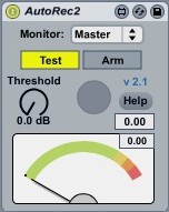 | Description: | This patch can monitor one of Live's tracks (including the Master track) for an outgoing audio signal and as soon as a certain threshold is reached it will start global recording. This can make recording a lot easier since you don't need to do anything but play your music (or instrument). After you selected a track to monitor you can set the threshold. You'll see the value displayed in the top number box as well as a small black dot on top of the meter scale. As soon as the signal reaches the threshold the big round button will flash as an indication. By default the device operates in testing mode; it only signals but no action is taken. As soon as you switch it to 'Arm' it will enable the global record as well as start the global transport the moment the threshold is reached. |