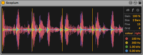 | Description: | Scopium is a beat-synced waveform display, with input gain control, channel selector, 4 adjustable bands and 3 colour schemes, "classic", "golden" and "monochrome". From version 1.1 : with floating window! https://www.youtube.com/watch?v=7dpNbnHtj_U Version History : 2.o1 - Click on the device logo now shows numbers instead of sliders. 2.o2 - Updated to Live 10. (Important! If you're still using Live 9, please, stick with the old version! There are major UI changes in Live 10, these will look ugly under 9) 2.o3 - user request : full MIDI mapping 2.o4 - adjustable beat grid and +100% extra gain boost for quite sounds 2.o5 - Ableton banks support added for Push 2.o6 - Thanks to Nicolas for the great ideas : switchable dB grid, floating window 3.oo - bug fixes, new UI, display fine tune 3.o1 - minor UI tweaks 3.o2 - LCD controls added 3.o3 - UI glitch fixed, device now follows correctly the selected Live theme 3.o4 - minor tweaks 3.o5 - Apple silicon check 3.o6 - dynamic UI 3.o7 - Live 12 compatibility check |
