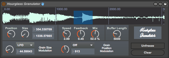 Description: Live audio granulator. Granulate your input source in real time to achieve effects ranging from delay to stutter to lush pads. The device can also act as a standalone granular synthesis engine by freezing the buffer and modulating the parameters. Tip: you can drop samples directly into the buffer window to start granulating with no input signal.