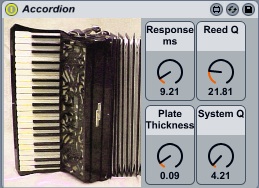 | Description: | A physical model of an accordion. The patch uses a purpose-built external called freereed~ which does fancy maths to model the vibration of a reed. It's polyphonic - 5 voices. Accordion takes MIDI inputs for frequency (note) and bellows pressure (velocity). If bellows pressure is too high or too low the reed doesn't vibrate. In the middle it makes surprisingly little difference to the level or tone. Other Controls: Response - time in ms for pressure to ramp up at the beginning of a note and down at the end. Reed Q and System Q - represent damping in the reed and the rest of the system. To sound, System Q must be a lot less than Reed Q (try about 1/5 to start with). Then change them to see changes in tone. Plate thickness: 0 to 1 representing thickness of the plate that the reed sits in. Start about 0.07 and try changing. Version 1.1: New build of the external freereed~ that should be more stable across machines. |