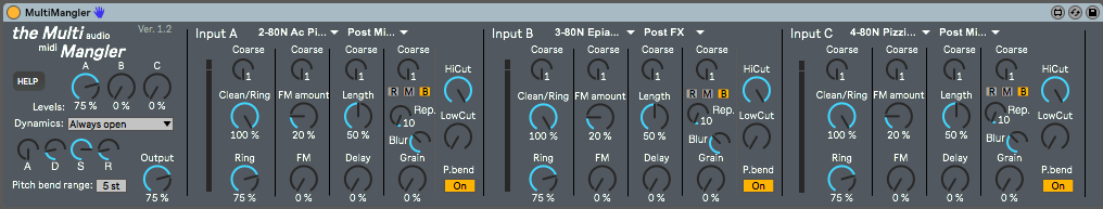 | Description: | The Multi Mangler is a Max for Live instrument that receives audio from up to three other tracks and does ring modulation, frequency modulation, short delays and grain looping on the signals, all corresponing to the frequency of incoming MIDI notes. This device can be used to create weird, morphing synth sounds/noises, mangling loops, glitch effects, robot voices and probably much more that no one has thought of yet. Requires Live 10 and Max 8. |