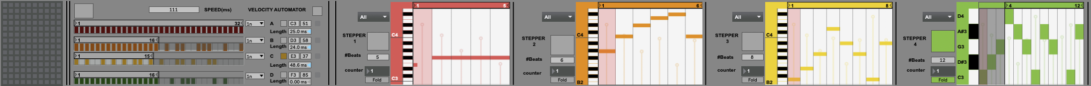 | Description: | Always wanted a step sequencer that plays ANY SUBDIVISION YOU CAN THINK OF and then combines them all together?! here's my first attempt at a MIDI step sequencer made for the rhythmically adventurous! features: - 4 "quantized" step sequencers with individual pitch, velocity, duration attributes - Automatic Velocity button, for duration randomization - 4 "un-quantized" step sequencers, with integrated pitch, velocity, duration attributes -seperate on/off for each step sequencer all in all; 8 step sequencers to mix and match your rhythmic delights. ***NEW UPDATE!!! -Preset Saving and recovery for individual parameters - using the preset squares (shift + hit one of the preset buttons, voila! you saved a preset!) - LOOP ENABLED - the device will continue to play original melody line from step sequencers, but will also begin playing the looped isorhythm quantized sequencer based on "little seq" by Little-Scale. Inspired by lessons from Yehezkel Raz |