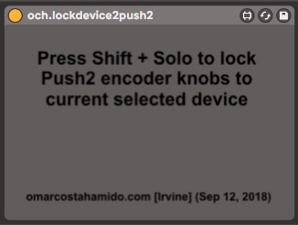 | Description: | lock push 2 knobs to currently selected device using a simple Shift+Solo shortcut. No need to switch to user mode, no need to setup new control surfaces, just drop this device anywhere and you'll even get visual feedback directly on Push's display. view demo here: https://youtu.be/vkloN6J4cck |