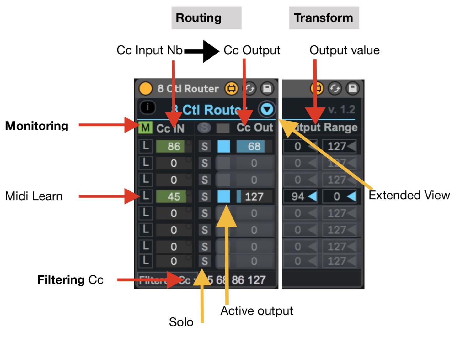 | Description: | This device convert midi Cc (control change) to any other midi Cc. It can be used as a midi Cc ROUTER or midi Cc VALUE CHANGER. It also MONITOR selected Cc input and output and FILTER/let Pass Thru unselected Cc. Main features ========== 8 slots with the ability to : - route change any Cc in number to any Cc out Nb - convert : change output range value - monitor : selected Cc number (input and output) - solo/mute : output CC - filter selected Cc and Thru/block other other Cc Nb - midi learn button Caution : ======== This device filter selected Cc to avoid any conflict. you can also decide to block all Cc Input usual option ========= - normal/extended view - « info" button and "edit device name" button - designed for push - info : takadfimi@free.fr |