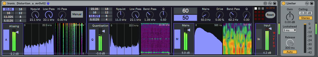 | Description: | A 'not-so-serious' emulation of some of the distortions that you may get in digital processing systems. Ironic distortion has four sections, although the final section (on the far right) is just the Input monitor/switch and the 'Reset' button. The three main sections provide the aforementioned distortions: Aliasing, Quantisation Noise, and Mains Modulation. Each section has controls at the top, graphic displays showing the spectrum and a scrolling sonogram, and a combined level meter, gain control/fader and Mute switch. The gain controls let you adjust the mix of distortion types, and the Mute switch allows you to switch them in and out quickly whilst developing a specific set of settings. Version 0.02 changes the 'Mains Modulation' to replace the low-pass filter with a 'Drive' rotary control because I found that I was always opening up the filter anyway, and there wasn't enough 'Umph'. This modification sounds much more like the sound that I associate with problems like faulty power supplies and hum loops, and could be used maliciously to upset recording studio engineers... Version 0.02 also adds in preset storage, and should store settings between sessions in Live. I freely admit that this isn't my strongest skill area! I haven't seen very many distortion devices that use spectral mirroring (but I'm sure that the Interweb will prove me wrong very quickly, and I get shown several Facebook groups devoted to specific aspects of a diverse, active and enthusiastic 'expert practitioner'-driven ecosystem...), and so that's why this is labelled as 'experimental'. It may even be unusual, in which case: enjoy! I would normally give some notes on possible applications, and for distortion, then one school of thought would be to use it carefully and sparingly, at low levels, rather like pepper on food - a 'less is more' approach. However, I am well aware that distortion can also be used like tomato ketchup, mayonnaise, sugar, sprinkles, whipped cream and other accompaniments where 'more is better' approach is favoured. You may use either, both or any combination as you desire. It seems that there may be problems on some platforms (or versions of Live) with the saving and recalling of parameter settings of version 0.01 and 0.02. Version 0.03 is an attempt to fix this... As they almost say on TV adverts: "Your audio may go up and down in value, quality and appeal, whilst alternative devices with similar and different functions are also available." (BTW, I'm always interested in feedback from users, and these often result in new or revised devices...) |
