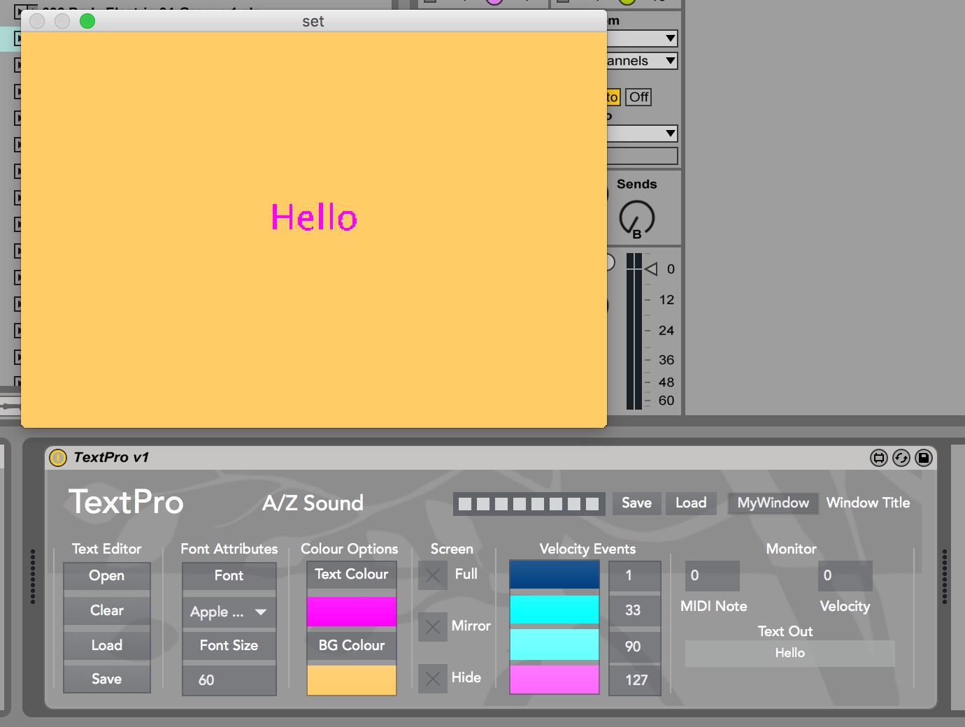 | Description: | TextPro provides a dynamic system for displaying text synced to MIDI note information. It can be used as a teleprompter or cueing device during live performances, a display for the audience and more! Features include the ability to assign velocity values to background colour, edit and save text directly inside and change text settings in realtime. Video demo here: https://youtu.be/ZY-aCBvGAYI Manual here: https://drive.google.com/file/d/1otbHL4ZX8-aNfUqJ1YIMNLdfWMguh7v1/view?usp=sharing v2.0 Update You can now use MIDI Program messages to seek to higher line indexes up to 1024 lines Pgm 1: C-2 to G8 = Lines 1 to 128 Pgm 2: C-2 to G8 = Lines 129 to 256 Pgm 3: C-2 to G8 = Lines 256 to 384 Pgm 4: C-2 to G8 = Lines 385 to 512 Pgm 5: C-2 to G8 = Lines 513 to 640 Pgm 6: C-2 to G8 = Lines 641 to 896 Pgm 7: C-2 to G8 = Lines 897 to 1024 See the v2.0 documentation here https://imgur.com/a/3THwJVI v2.1 Update Changed default video window position to center of screen |