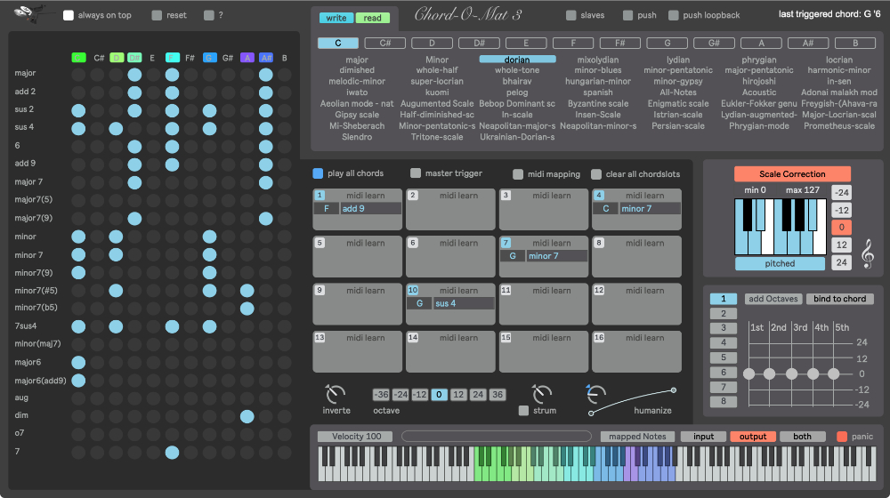 | Description: | Chord-O-Mat 3 is a Max for Live Chord Library and Trigger Device for Ableton Live 10 with Push integration. It’s designed to have quick access to the chords in a Scale, to explore Chords, make chord progressions and play Live. With the Instant Scale Device you’re able to make harmony changes over your whole Live Project. The Instant Scale Device is MPE compatible Features of Chord-O-Mat 3: - More than 40 Scales - All Scales from Push 1, 2 & 3. - Shows all Chords from the selected Scale. - Automatically maps all chords to your Keyboard, so you're able to Trigger a chord with one key. - create Custom Chord Sets - make Chord Progressions with your Midiclips. - clear User Interface. - Strumming. - Octave Designer to add or remove Notes from a chord - integration of Push 1 & Push 2 - min. System Requirements: Ableton Live 10 / Max for Live 8 - Scaleable GUI (since Version 3.0.6) Version 3.3. brings Push 3 Compatibility check the Video here: https://youtu.be/_3sblXiLrLk https://youtu.be/bv4zCUZsCu4 https://youtu.be/o2rx32poMFc |