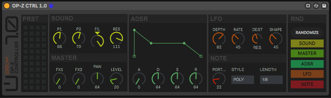 | Description: | OP-Z CTRL 1.0 is a midi max for live device to control the OP-Z. The UI is divided in the main sections of the hardware, Sound, ADSR, LFO, Note and Master. There is a Preset storage section where you can save up to 44 presets within the Live project. And finally there is a Randomize section where you can define where the randomization affect by sections: Sound, master, ADSR, LFO and Note. You can use one device per voice. Be sure to put the device in a MIDI channel and configure the MIDI Output to route the desired OP-Z voice. Don't hesitate to contact me if you find any problem or if you have an idea to update the device :) |