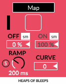 | Description: | This simple device lets you control a mappable ramp with a toggle. It's made to quickly and precisely ramping between values in a live situation, but can also be used to toggle between different audio-rate modulation sources. Control the ramp time (ms and sync), and curve. Control the values ramped between with the “Off” and “On” parameters. Individual Smoothing toggles for the on and off values. Turn them on to get rid of clicks while controlling manually. Turn them off when mapped for proper audio-rate modualtion. Info Text and Push parameter bank for all automatable parameters. -Heaps of Bleeps |