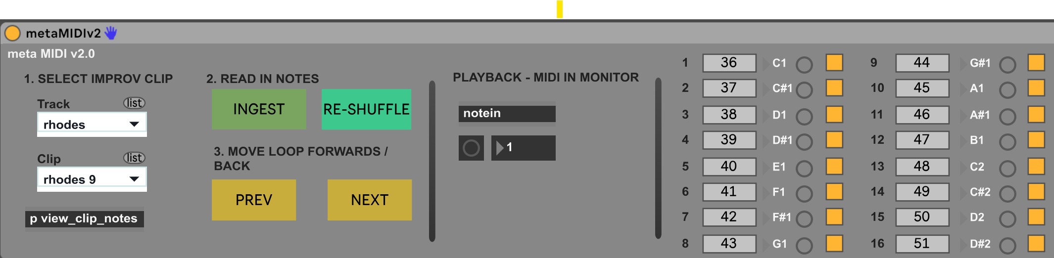 | Description: | Automatically chop up midi clips and assign them to 16 pads for MPC style playback. Input: Midi clip Outputs: 16 midi clips with different loop positions, quantised to the note start. Idea: Mark Suppes |